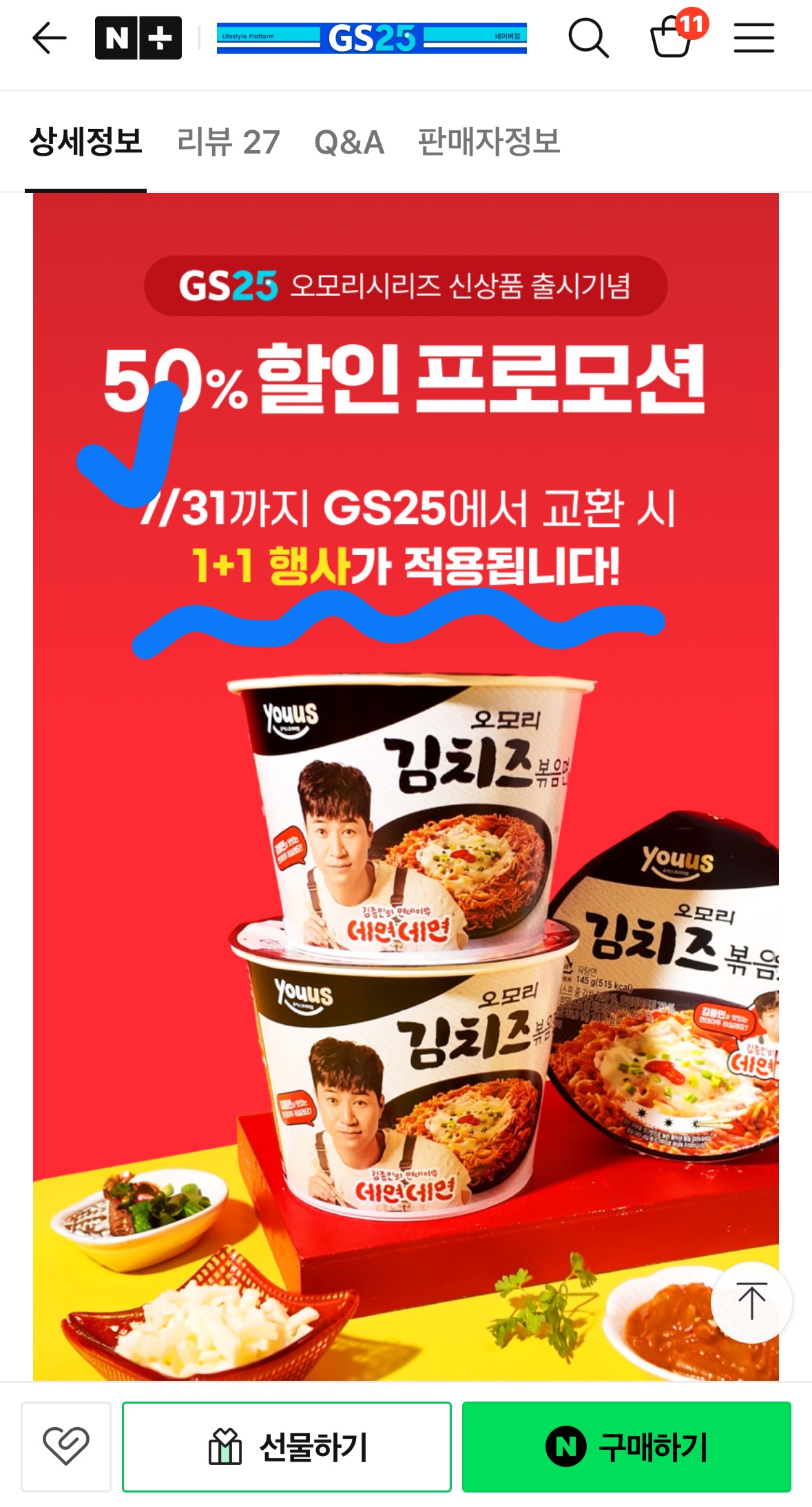 이게 바로 화룡점정! 현재 GS25 매장에서는 '오모리김치즈볶음면' 출시 기념 1+1 행사를 진행 중입니다. 따라서 970원짜리 상품권 1개만 제시해도, 2개의 제품을 받아올 수 있는 마법이 펼쳐집니다.
