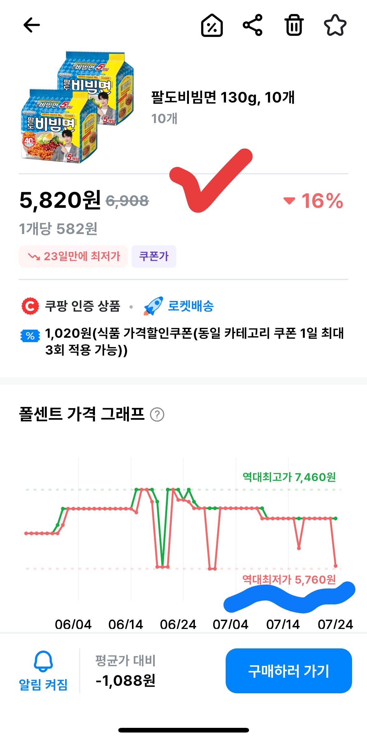 보이시나요? 편의점에서 한 개 사 먹을 돈으로 여기에서는 두 개를 사고도 넉넉하게 남습니다. 이건 정말 '안 사면 손해'라고 자신 있게 말씀드릴 수 있는 가격입니다. 아래 이미지에서 보시는 것처럼, 최근 23일 내 최저가를 기록하고 있으니 타이밍도 완벽합니다.