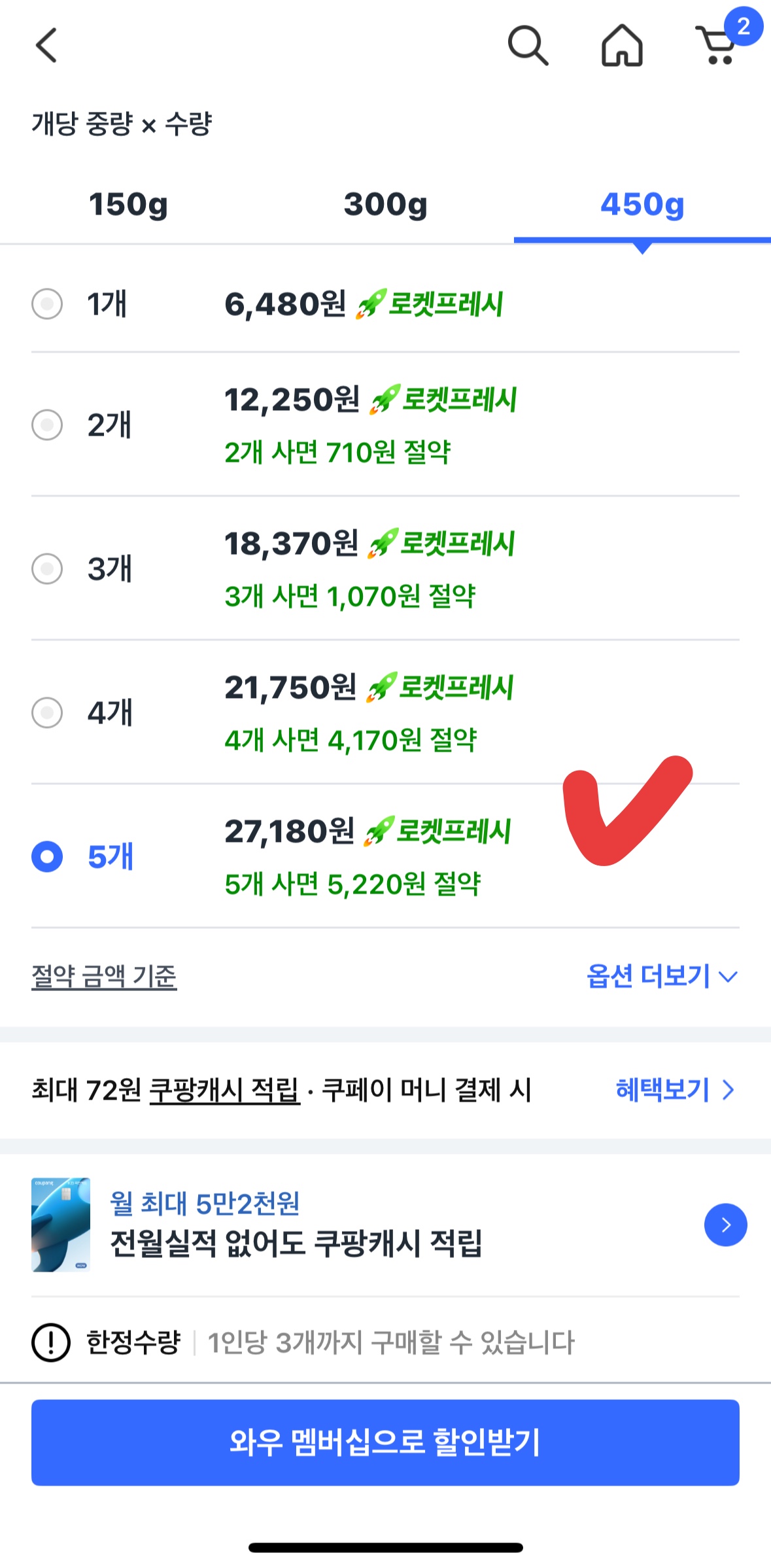 - 핵심 팁: 와우 회원 쿠폰 적용 시 역대급 최저가! 1인당 3개 구매 제한!