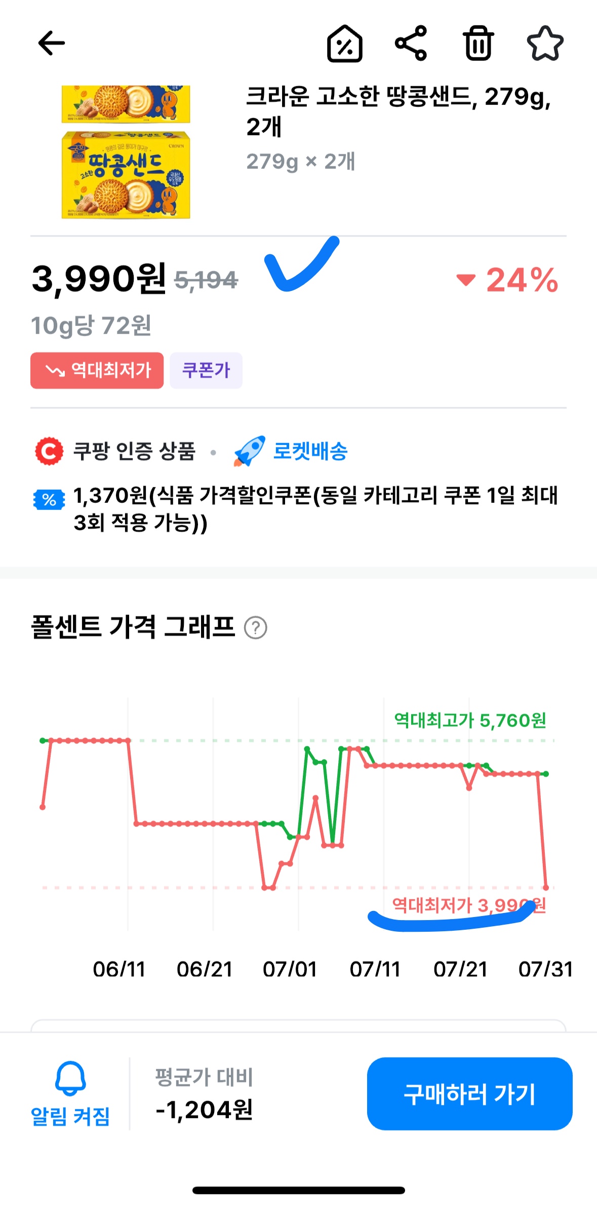 | 쿠팡 땅콩샌드 2개 | 9,200원 | 3,990원 (1,995원/개) | 현재 최저가! 로켓배송! |