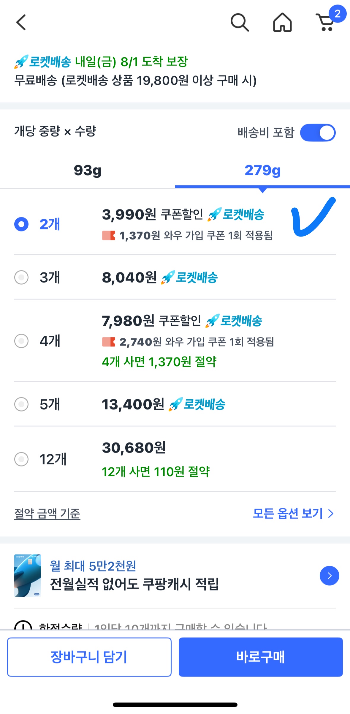 - 핵심 팁: 와우회원이라면 식품 할인 쿠폰 꼭 적용! 2개 묶음이 가장 가성비 좋음!