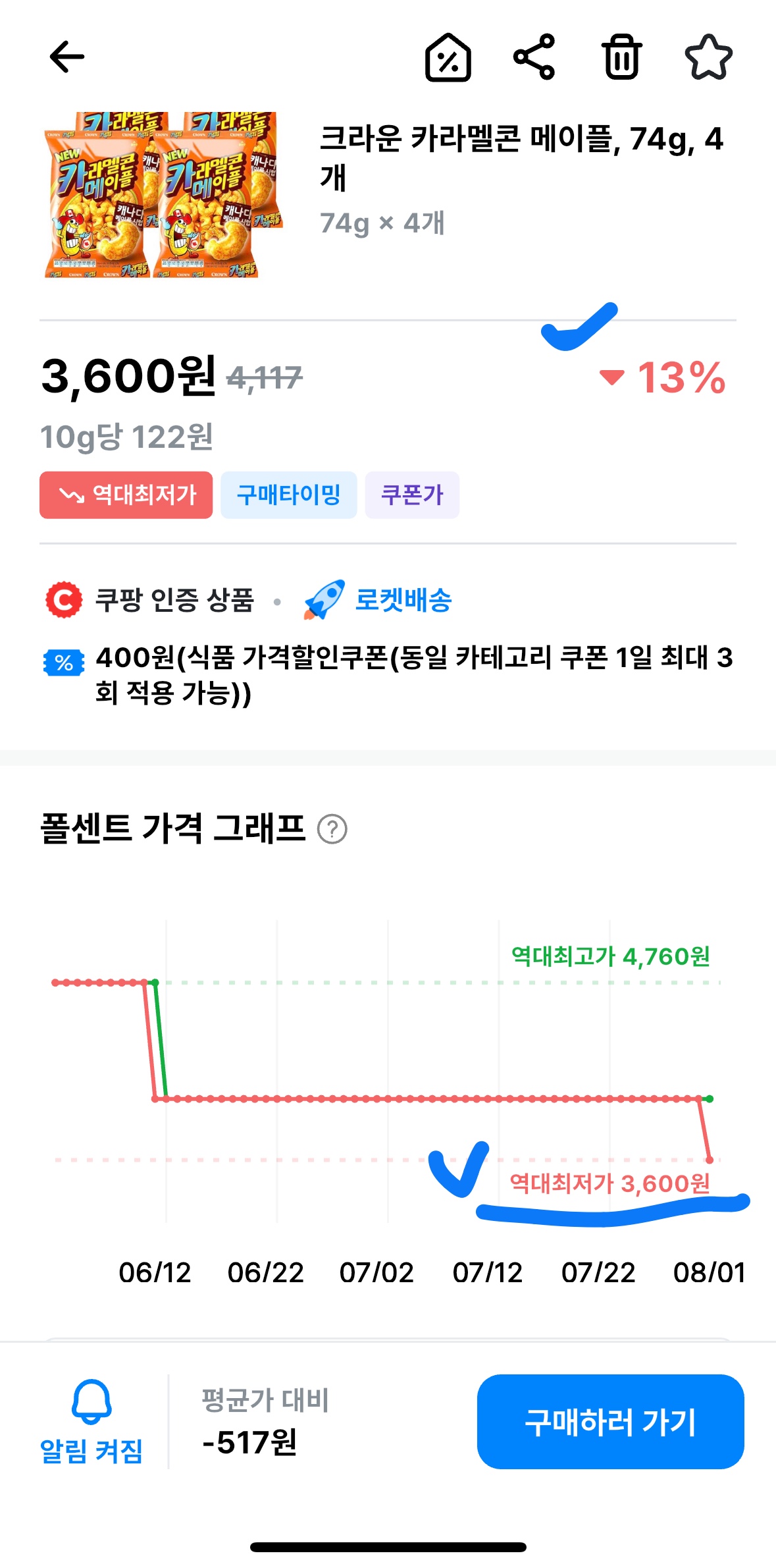 - ✅ 핵심 꿀팁: 400원 추가 할인 쿠폰 적용 필수! 가격 그래프가 증명하는 역대급 핫딜!