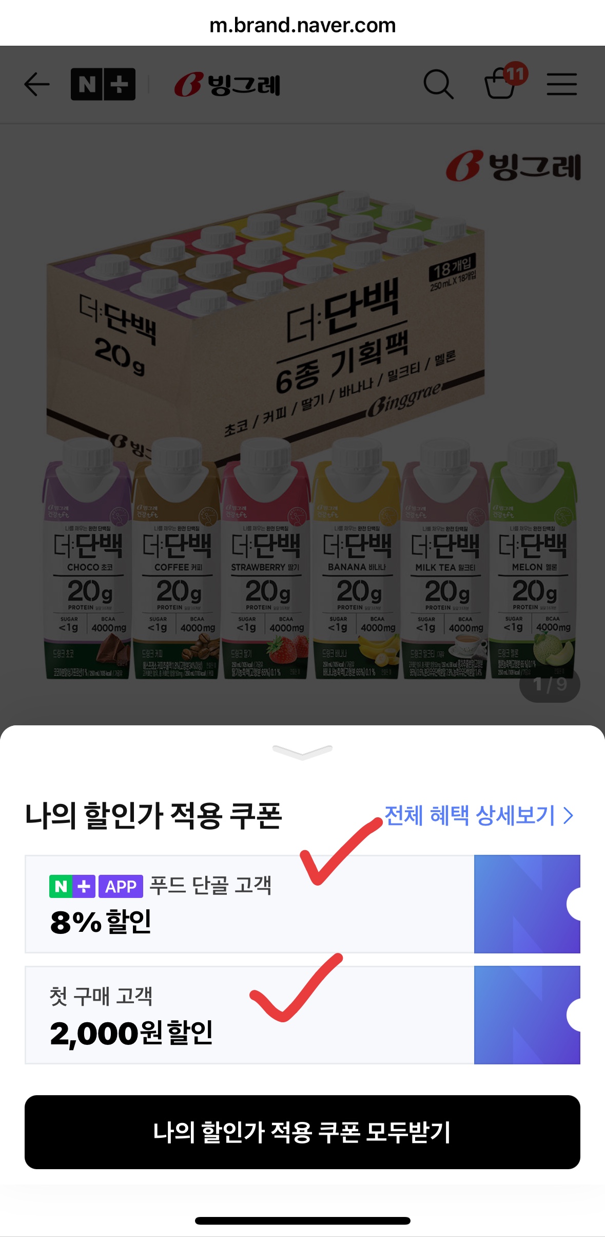 2. 상품 페이지에서 [N+ APP 푸드 단골 고객 8% 할인] 쿠폰을 다운로드하여 적용합니다.
