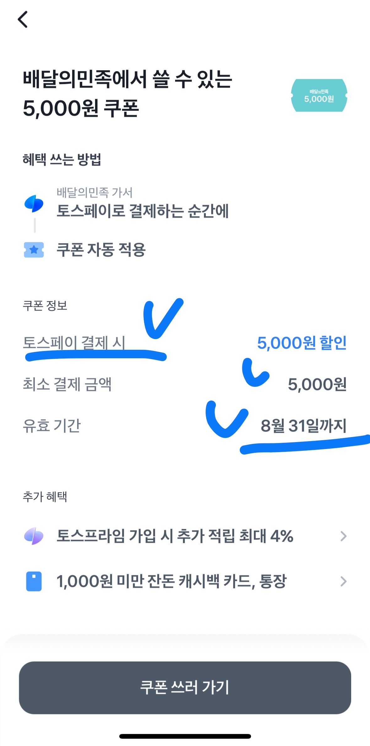 2. 꽝이더라도 실망은 금물, 5,000원 쿠폰 활용하기! 100원 딜에 당첨되지 않더라도, 토스페이로 배달의 민족에서 5,000원 이상 결제 시 사용 가능한 5,000원 할인 쿠폰이 기본으로 제공됩니다. 최소 주문 금액이 5,000원이므로, 커피나 샐러드, 간단한 분식 등을 주문할 때 배달비 부담 없이 거의 공짜로 즐길 수 있는 절호의 기회입니다.