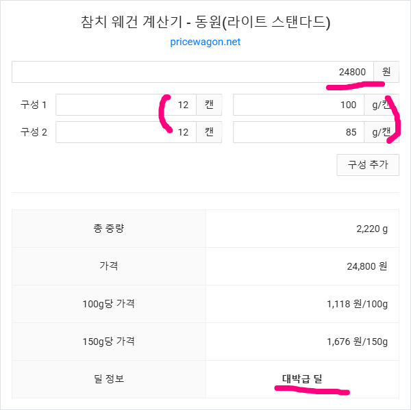 1. 스마트한 구성: 가장 활용도 높은 100g(12캔)과 85g(12캔)의 조합으로 낭비 제로!