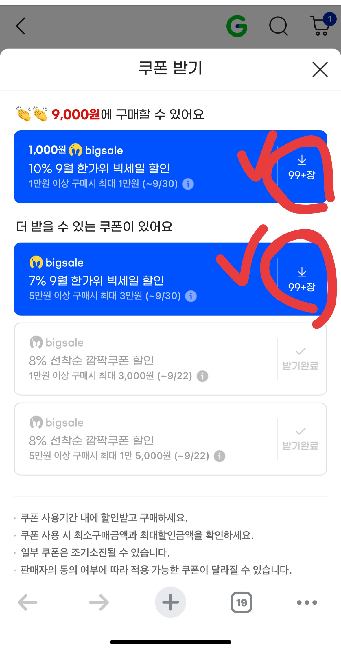 이 가격은 그냥 나오는 것이 아닙니다. G마켓 빅세일 기간에만 제공되는 '1,000원 할인쿠폰'을 반드시 다운로드하고 적용해야 최종 9,000원 혜택을 받을 수 있습니다. 아래 이미지의 '쿠폰 더 받기'를 눌러 지금 바로 쿠폰부터 챙겨두세요.