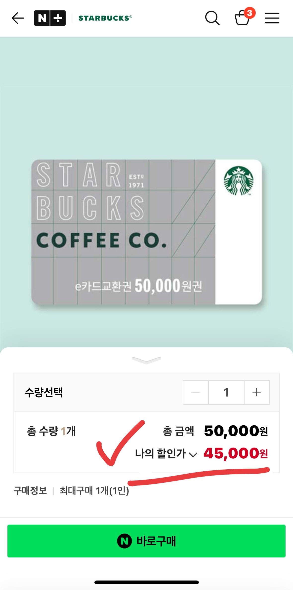 1. 당신은 45,000원으로 50,000원짜리 스타벅스 카드를 가질 수 있습니다.