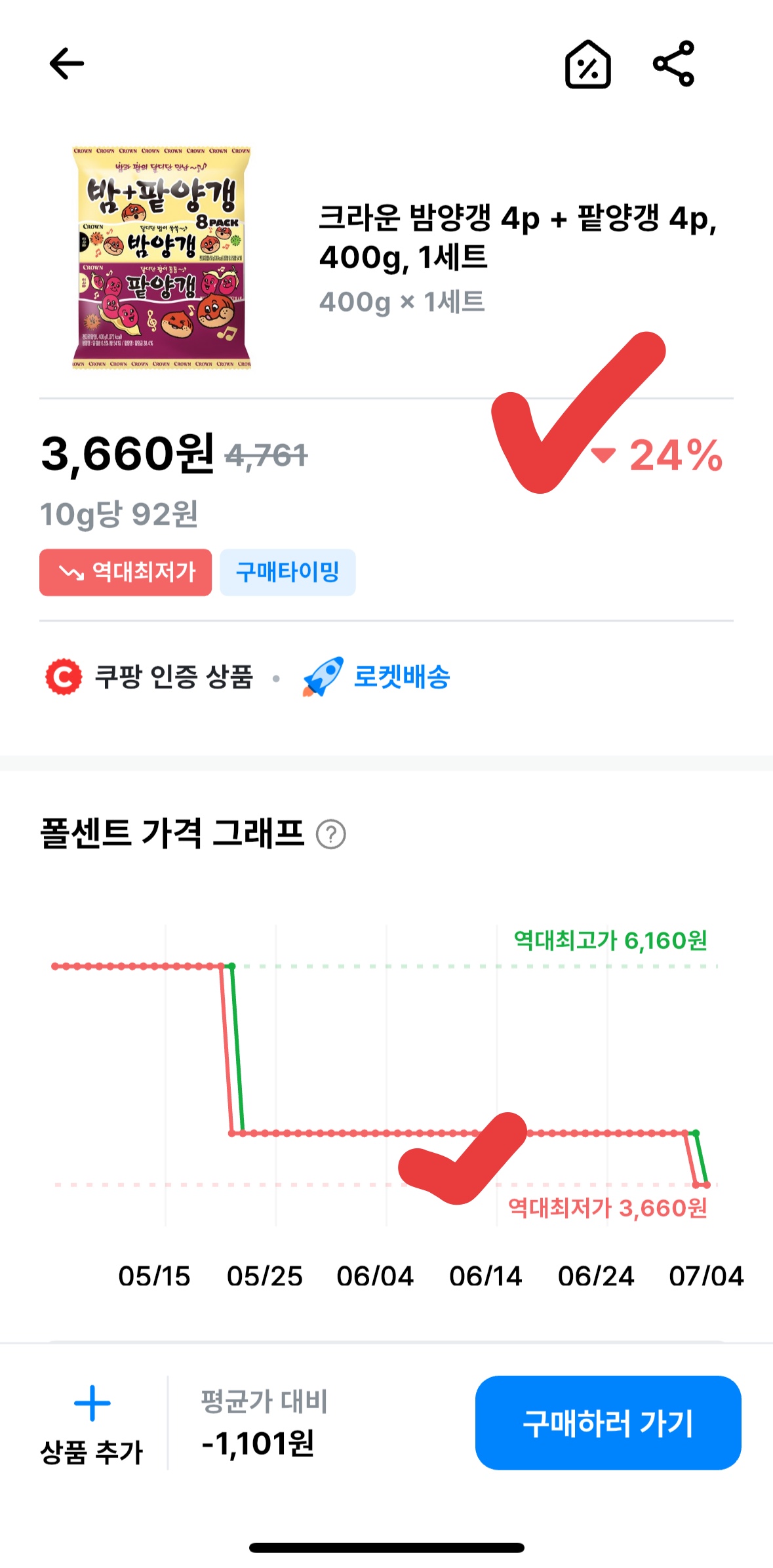 - ✅ 상품: 온 가족 국민 간식, 크라운 밤양갱 4p + 팥양갱 4p (총 400g)