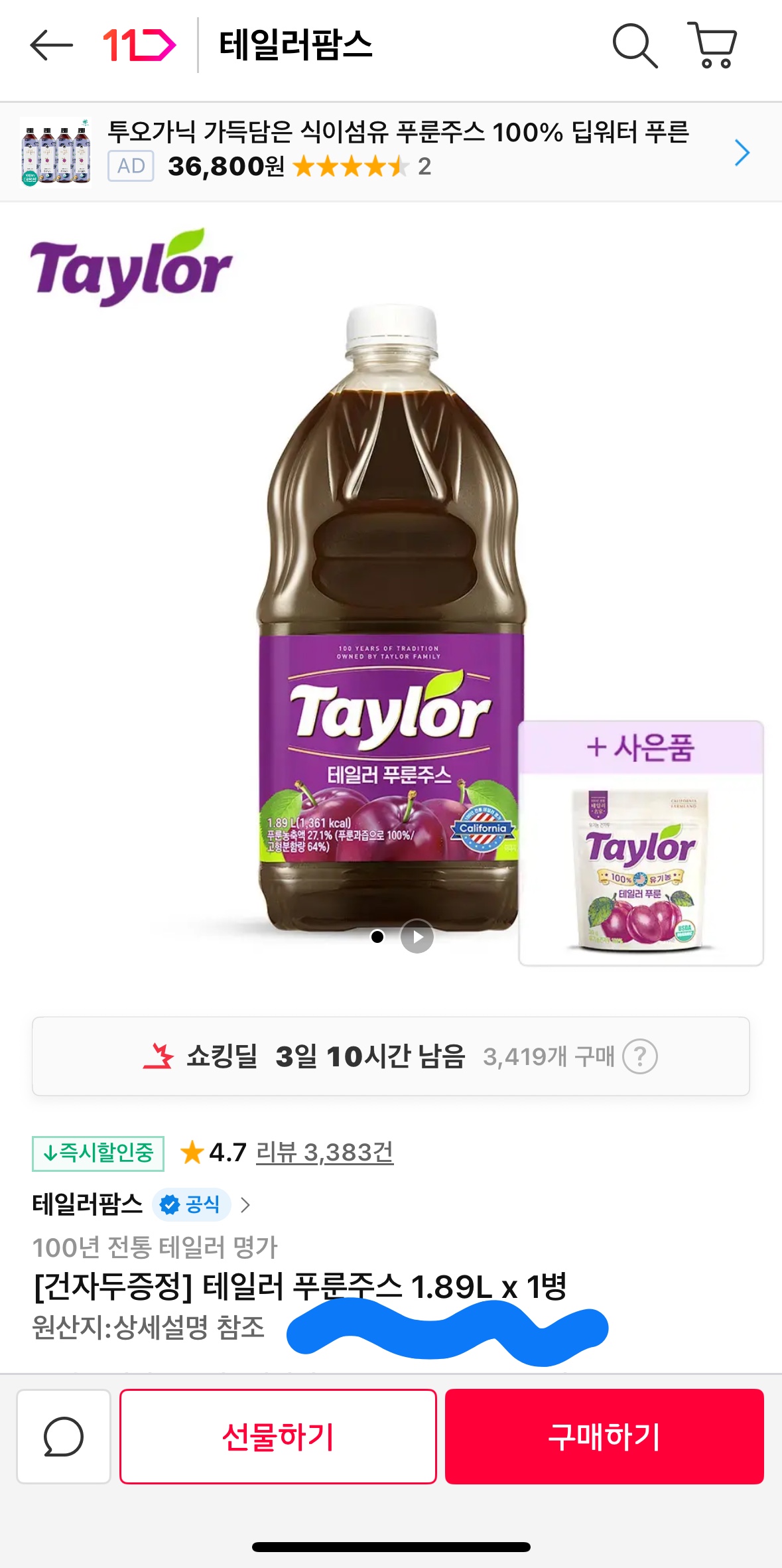 [11번가] [건자두증정] 테일러 푸룬주스 1.89L x 1병