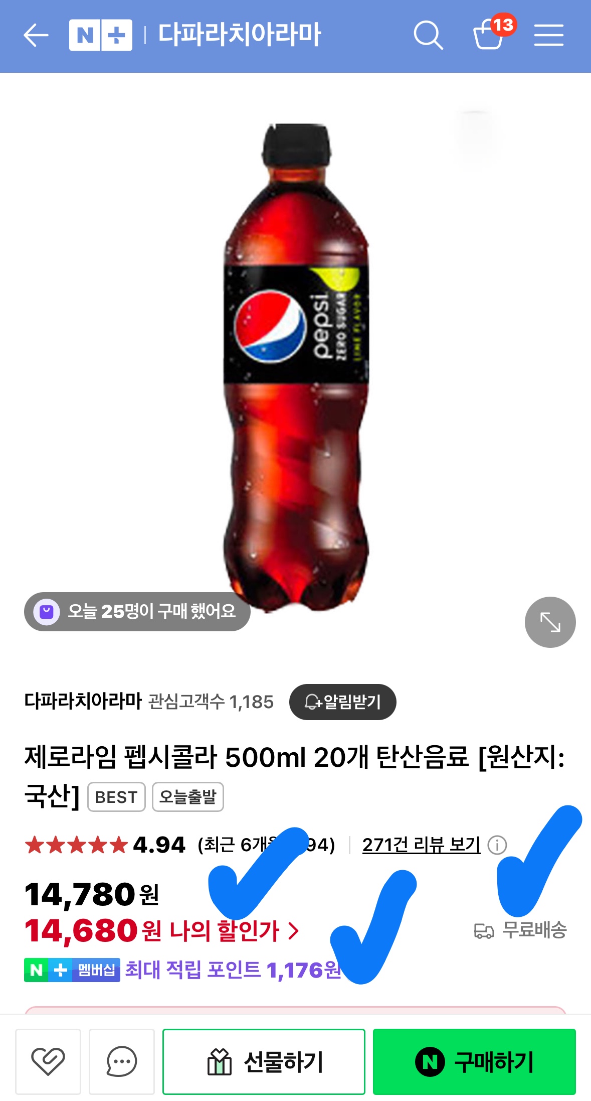 - ✅ 상품: 칼로리 걱정 없는 상큼함, 펩시 제로 슈거 라임 500ml 20병
