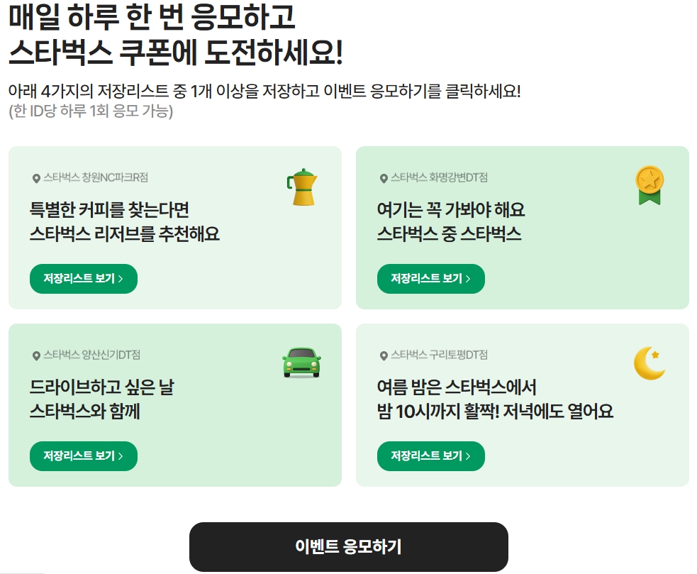 바로 <네이버 지도 X 스타벅스>가 함께하는 '저장리스트 저장하고 스타벅스 쿠폰 도전' 이벤트인데요.