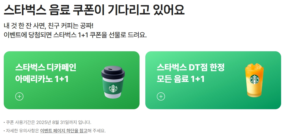 - 🔍 쿠폰 사용 조건 숙지: '디카페인 아메리카노 1+1', 'DT점 한정 1+1' 등 쿠폰마다 사용 조건이 다릅니다. 사용 불가 매장에서 쿠폰을 내미는 불상사가 없도록 조건을 미리 확인하는 센스!