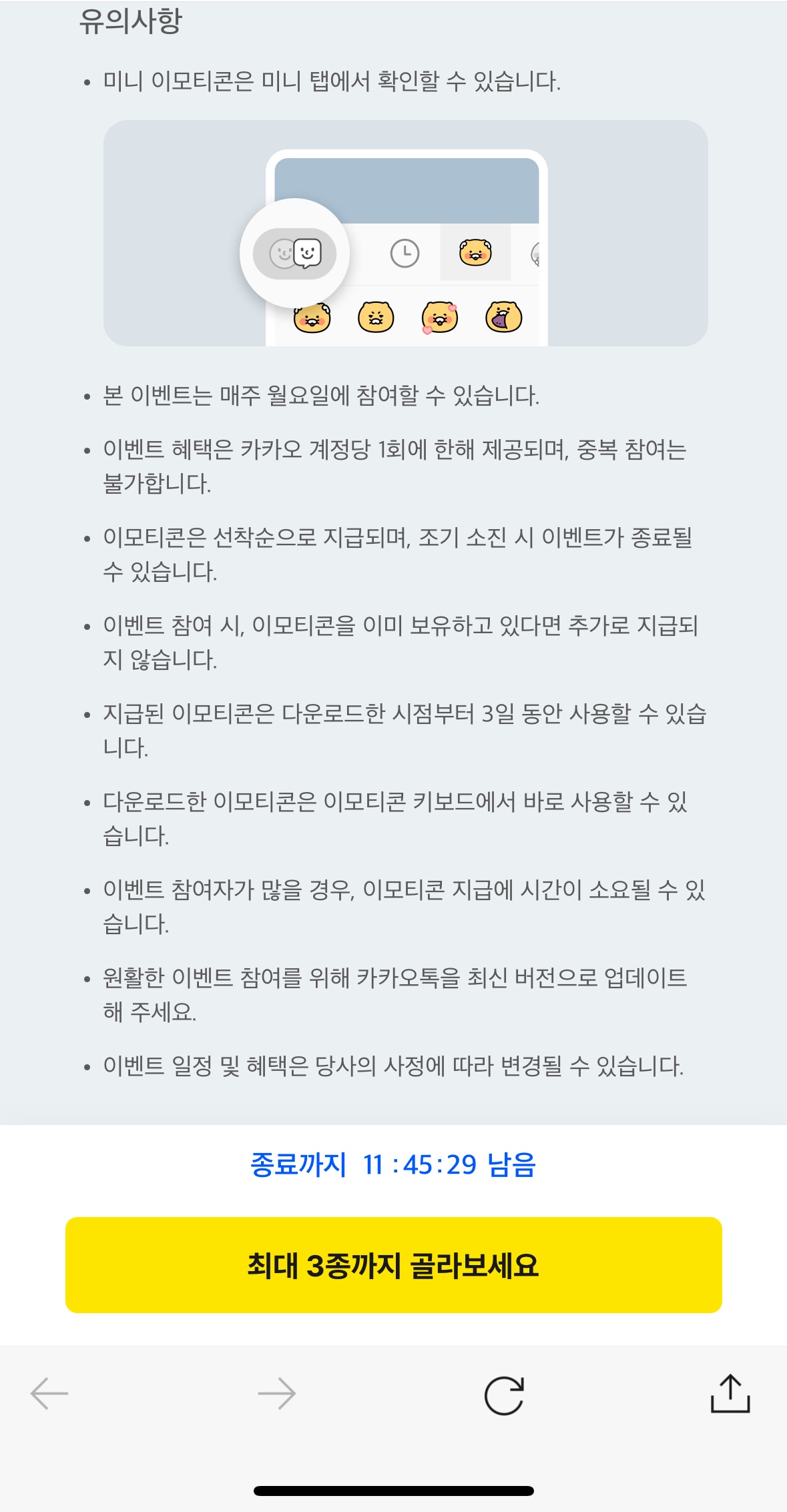 바로 '월요일 오전'을 공략하는 것입니다. 이 이벤트는 선착순으로 진행되어, 인기 있는 주는 오후만 되어도 소진되어 마감될 수 있습니다. 월요일 아침, 출근길 지하철이나 버스에서 잊지 말고 바로 참여하는 것을 습관으로 만들어 보세요. 스마트폰에 '월요일 오전 9시, 이모티콘 받기' 알람을 설정해 두는 것도 좋은 방법입니다.