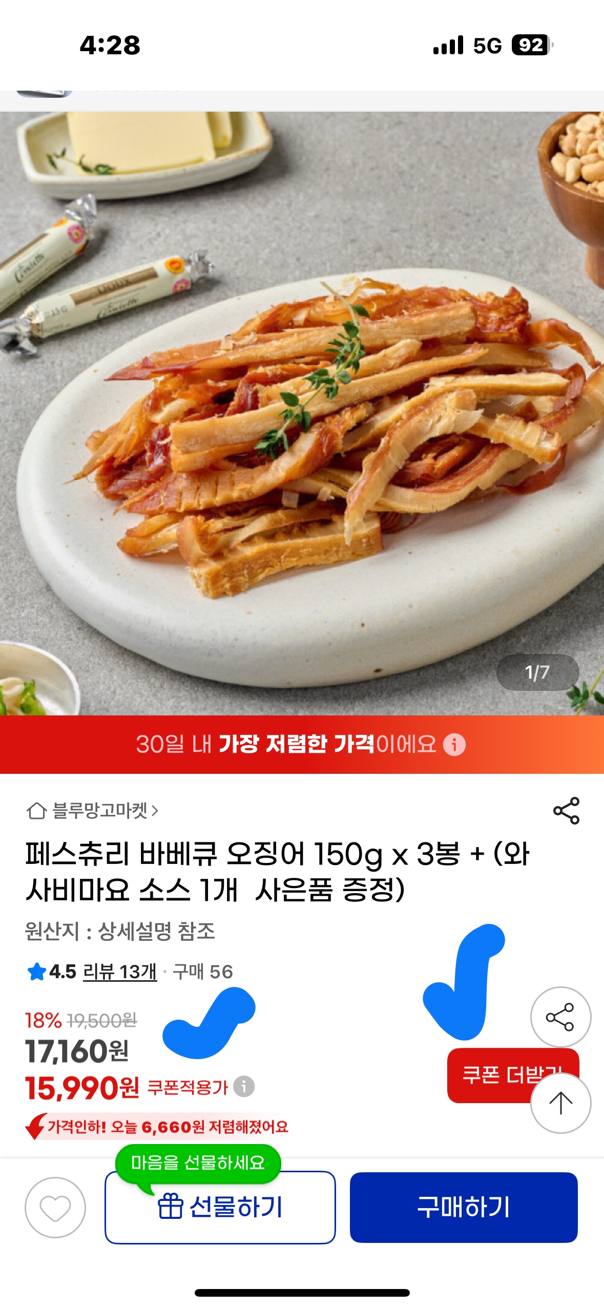 - ✅ 상품: 부드러움의 신세계, 페스츄리 버터 바비큐 오징어 150g x 3봉 + 와사마요 소스