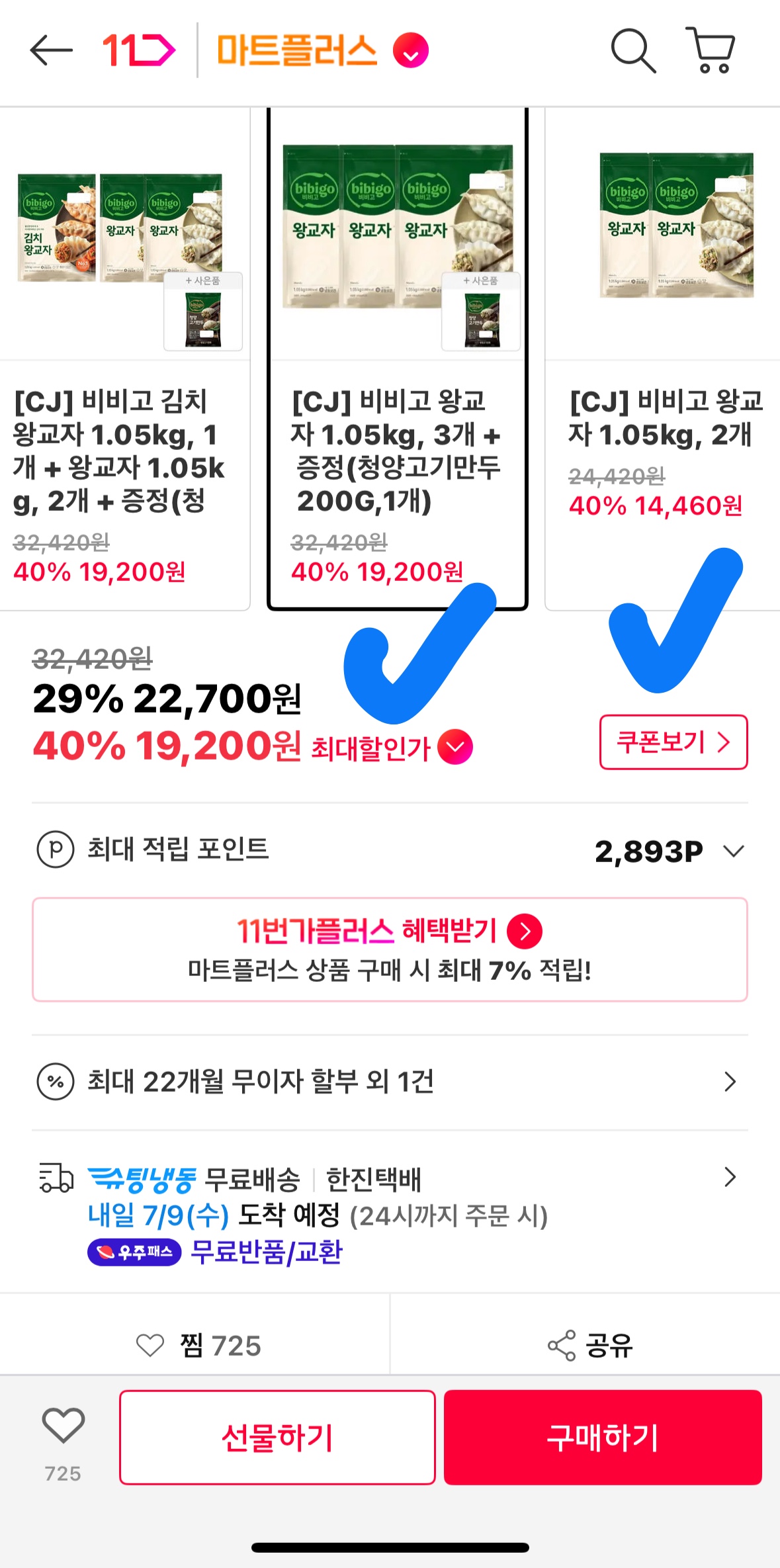 - ✅ 상품: CJ 비비고 왕교자 1.05kg 3봉 + 청양고기만두 200g (총 3.35kg)