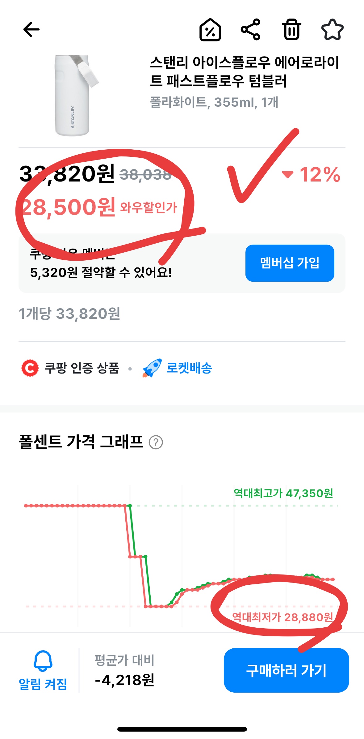 보이시나요? 이 제품의 역대 최저가가 28,880원이었습니다. 그런데 지금 쿠팡 와우 할인가가 얼마라고요? 28,500원! 말 그대로 역사상 가장 싼 가격에 살 수 있는 절호의 기회인 겁니다. 이런 딜은 1년에 한두 번 올까 말까 합니다. 이건 정말 고민하면 손해예요!