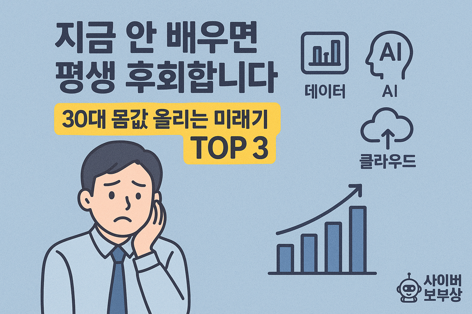 안녕하세요, 당신의 커리어와 지갑까지 지켜드리는 사이버 보부상 김 과장입니다.'AI 때문에 내 자리가 없어지면 어떡하지?', '다들 코딩이다 뭐다 배우는데, 나는 뭘 해야 할지 모르겠다.' 이런 불안감, 혹시 당신의 이야기는 아닌가요? 30대는 경력의 중요한 분기점이지만, 동시에 미래에 대한 막연한 두려움이 가장 커지는 시기이기도 합니다.하지만 무작정 불안해하며 시간을 보내는 것만큼 손해는 없습니다. 지금 당신의 연봉과 미래 가치를 결정하는 것은 ‘어느 회사에 다니는가’가 아니라, ‘어떤 기술을 다룰 줄 아는가’입니다. 특히 AI 시대의 흐름을 읽고 핵심 기술을 당신의 업무에 접목할 줄 아는 능력은, 그 무엇과도 바꿀 수 없는 강력한 무기가 될 것입니다.오늘, AI 시대에 대체되지 않는 경쟁력을 갖고 싶..